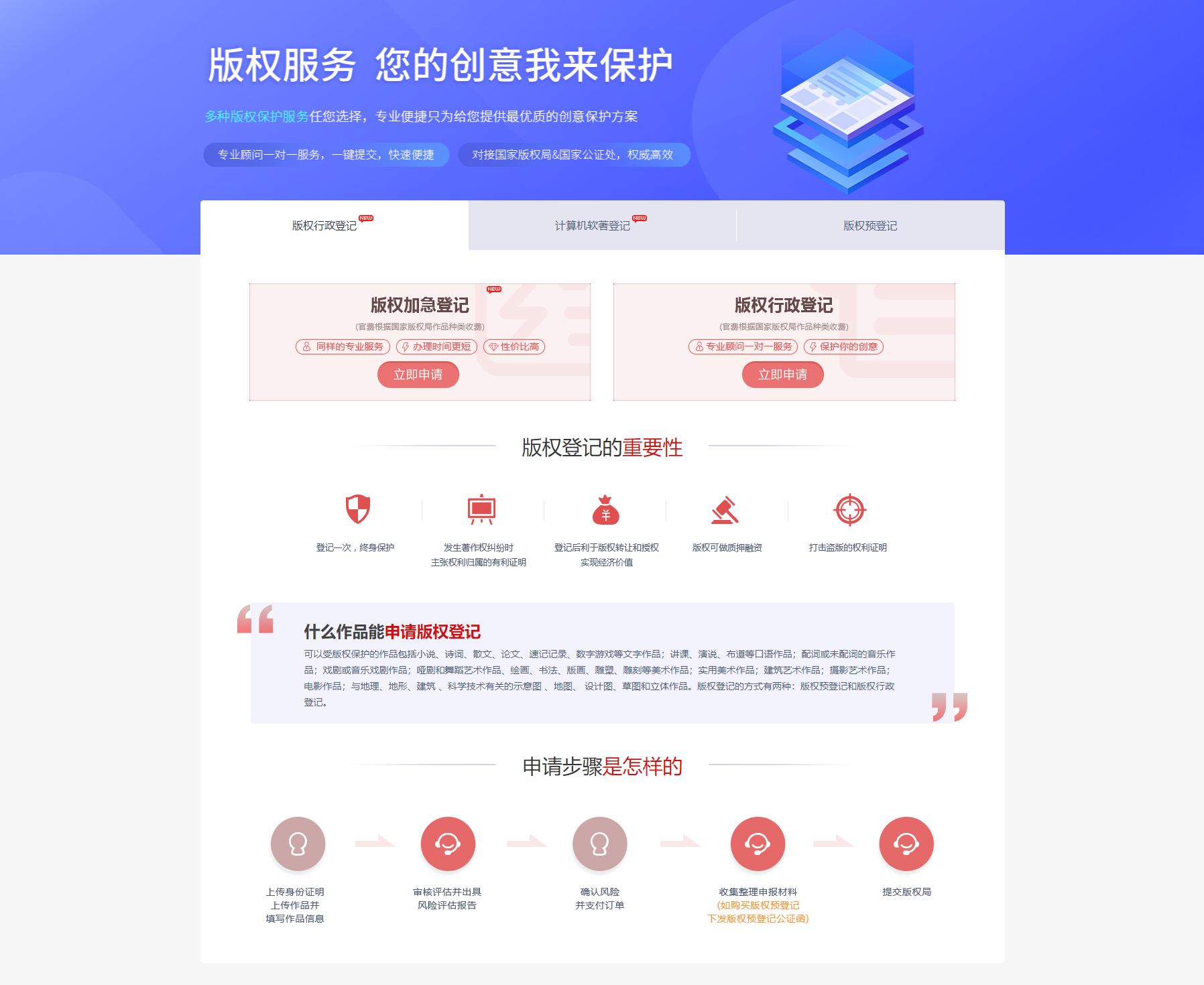 版权行政登记是指著作权有关当事人依照法律规定,向登记机关申请,将作品及其权利登载于登记簿的行为。这一行为的主要目的是为了固定著作权权属,加强对创作者的权益保护,明确创作者与作品之间的关系,并加强对著作权的行政保护。版权行政登记的范围和所需材料 版权登记的范围包括但不限于以下类型: 文字作品 口述作品 音乐、戏剧、曲艺、舞蹈、杂技艺术作品 美术、建筑作品 摄影作品 视听作品 工程设计图、产品设计图、地图、示意图等图形作品和模型作品 计算机软件 符合作品特征的其他智力成果
